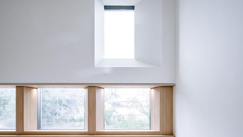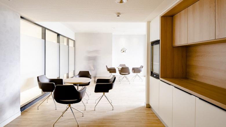 Die Stationen sind ringförmig um einen Innenhof organisiert, sämtliche Zimmer orientieren sich nach außen und bieten wunderbare Ausblicke in die Landschaft, gerahmt von einem großen Holzelement. Empfang, Stützpunkt und Personalaufenthaltsräume bilden das großzügige Stationszentrum nahe des jeweiligen Stationseingangs. Tagesbelichtete Flure führen zu zusätzlichen kleinen Loungebereichen – besondere Angebote neben den komfortabel ausgestatteten, großzügigen Patientenaufenthaltsräumen.