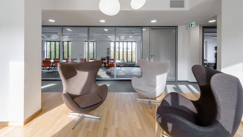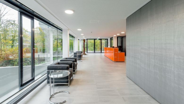 Der Kern des Neubauteils wird über die Weiterführung des bestehenden Magistrale im Erdgeschoss erschlossen. Auf dem Weg dorthin werden Konferenzraum und Cafeteria ohne Kreuzung der Bürozonen passiert. Die Büroflächen sind konstruktiv stützenfrei. Damit sind beliebige Aufteilungen vom Zellenbüro bis zum Großraumbüro möglich.