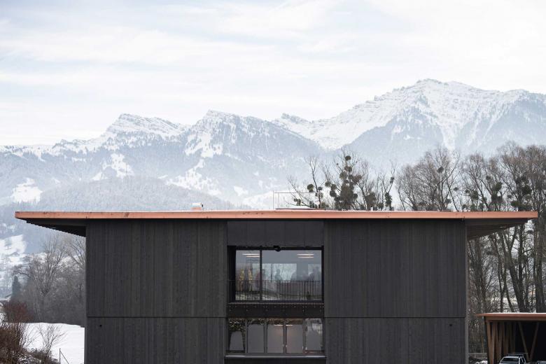 Tragwerk und Fassadenverkleidung sind komplett aus Schweizer Holz gefertigt. Lediglich das Treppenhaus ist aus Stahlbeton erstellt. Das Rückgrat bilden zwei 24 Meter lange und 6.5 Tonnen schwere Holzfachwerkträger, die im Erdgeschoss die Einstellhalle längs überspannen. Nichts Überflüssiges, kein Firlefanz – die Schönheit ergibt sich aus der Reduktion aufs rein Funktionale. Dadurch strahlt der schlichte, prägnante Bau Präzision und Klarheit aus.