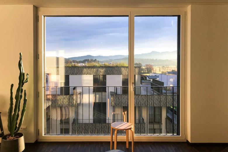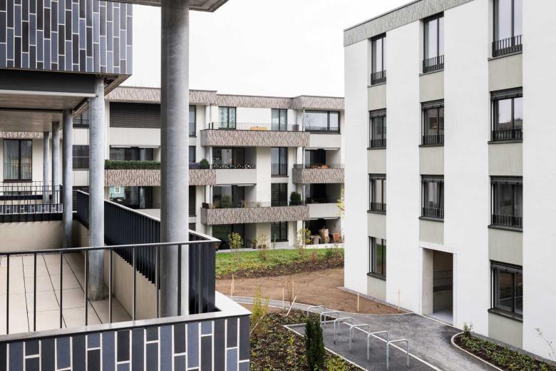 Vielfalt trotz Einheit. Die Überbauung integriert sich optimal in die heterogene Bebauungsstruktur: Die drei Langhäuser orientieren sich mit Volumen und Ausrichtung an der Siedlung Erlen im Norden, die Punkthäuser schaffen eine Verbindung zum Quartier im Westen des Perimeters und binden die Anlage zusammen. Zudem entsteht eine angenehme Durchlässigkeit in Nord-Süd-Richtung. Im Herzen der Anlage befindet sich ein grosszügiger und begrünter Platz. Der Wohnungsmix der 130 Miet- und Eigentumswohnungen ist breit und die Grundrisse sind facettenreich. Dachrand und Balkonbrüstungen sind mit vertikalen Keramikplättli in drei verschiedenen, harmonischen Farbtönen verkleidet.