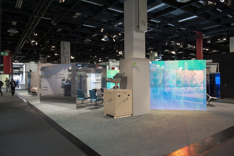 Office Design als kreatives Gesamtkonzept, kommt in der Sonderausstellung der Orgatec im „Competence Center Space“ zum Ausdruck. Die Rauminstallation entpuppte sich als eines der Top Messe-Highlights. Schimmernde Spiegel und Silber, dichroitische Oberflächen und Typografie prägen die Cubes außen. Innen entfalten sich unterschiedliche Themenwelten, von der Arktis bis in die Disco – indem alles, nur kein Büro, als Analogien der Bürowelt von Think-Tank bis Always-On-Kultur, gezeigt wird.