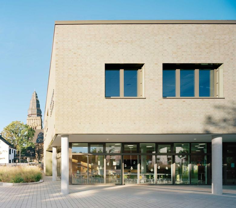 Der Neubau der dreizügigen Grundschule Grünstraße formuliert eine klare städtebauliche Adresse im historischen Kern von Velbert. In direkter Nachbarschaft zur Christuskirche und zur Martin-Luther-King-Schule schafft das Ensemble aus zwei eigenständigen Baukörpern einen geschützten Pausenhof und verknüpft Schule, Sport und Quartier miteinander. Der Schulbaukörper zeigt mit der offen gestalteten Fassade der Mensa sein Gesicht zur Grünstraße. Von hier aus werden Besucher:innen über einen vorgelagerten Willkommensplatz zum südöstlich angeordneten Haupteingang der Schule geführt. Die Sporthalle orientiert sich zur Kurze Straße, nutzt die natürliche Topografie des Grundstücks und fügt sich maßstäblich in das Gebäudegefüge ein.