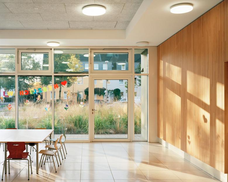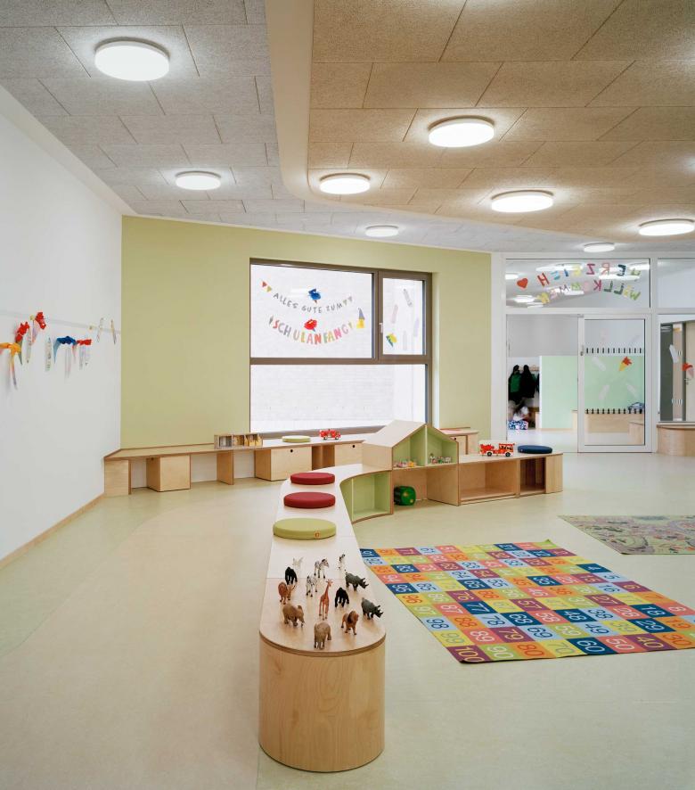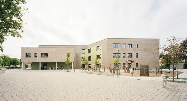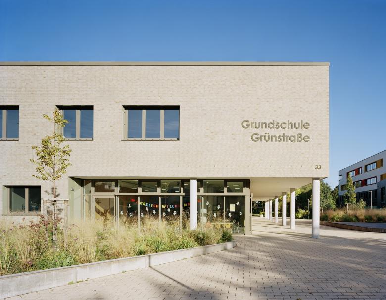 Das Konzept bietet vielfältige Blickbeziehungen und Orte zum Ankommen, Lernen, Spielen und Verweilen. Die helle Klinkerfassade mit farbigen Vorhangfassaden und Leibungen differenziert die Bereiche und bildet einen gestalterischen Rahmen. Sitzstufen, Spielgeräte und zwei grüne Klassenzimmer im Außenraum ergänzen die Lernlandschaft um naturnahe Aufenthaltsorte.