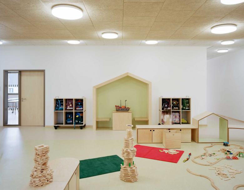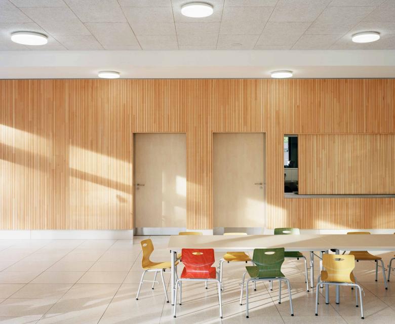Die innere Organisation des barrierefreien Schulgebäudes ist in drei Minischulen, Verwaltung, Mensa und Mehrzweckbereiche gegliedert. Herzstück ist das zentrale, dreigeschossige Foyer mit Galerie, das als Verteiler, Treffpunkt und Aufenthaltsfläche fungiert. Großzügige Fensterflächen und verglaste Türen schaffen Sichtbeziehungen und sorgen für eine hohe Tageslichtqualität in den offenen Lernbereichen mit Sitznischen, Gruppen- und Differenzierungszonen.