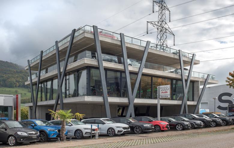 Der Showroom und der angrenzende Parkplatz der Römergarage in Frick konnte das wachsende Volumen an Neu- und Occasionswagen nicht mehr aufnehmen. Also entschieden man sich auf dem Parkplatz ein fünfgeschossiges Parkhaus zu errichten. Es sollte Abstellplätze für rund 60 Wagen bieten, eine hochwertige Übergabe-Lounge beinhalten und als markantes Bauwerk eingangs Dorfs einen „Wow-Effekt“ erzielen.