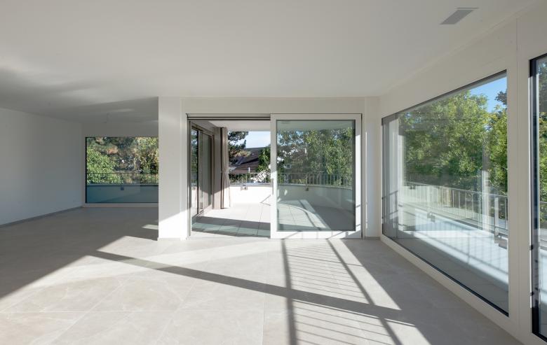 In direkter Nachbarschaft wurde das neue Mehrfamilienhaus erstellt. Es nimmt die Trapez-Form der Parzelle auf und fügt sich so geschmeidig in das bestehende Quartier. Mit dem vorspringenden ersten Obergeschoss, dem abgerundeten Grundriss und den hellen Brüstungen wirkt das Gebäude leicht und elegant. Der Neubau bietet zehn Wohnungen, die um einen zentralen Treppenhauskern angeordnet sind.