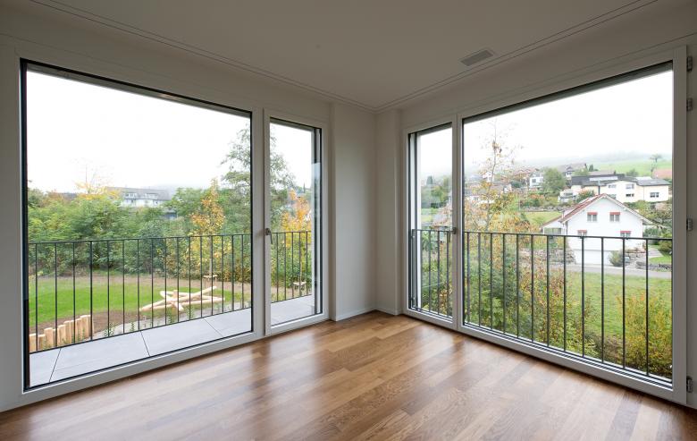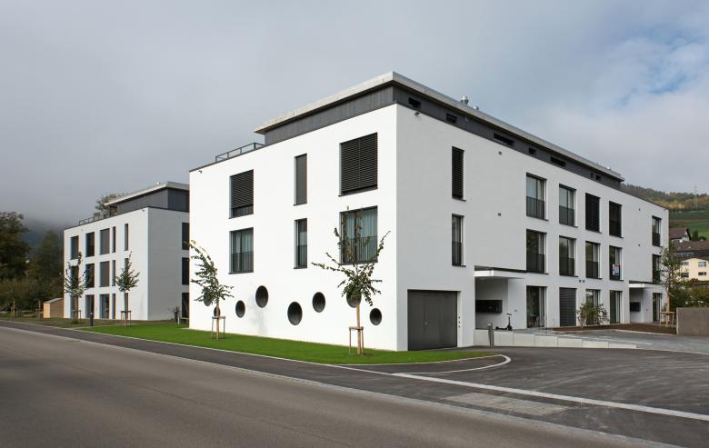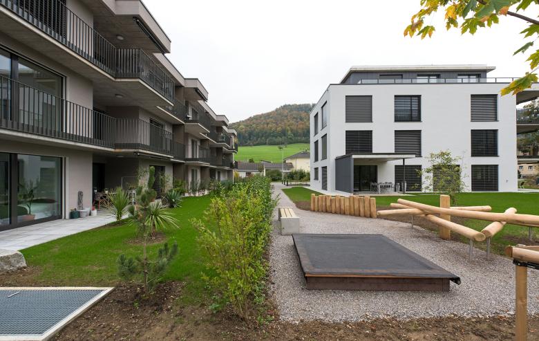 Die 2,5- bis 4,5-Zimmer-Wohnungen zeichnen sich durch einfache und gut zu möblierende Grundrisse aus. Dank den raumhohen Verglasungen verfügen sie über sehr helle, lichtdurchflutete Räume, in denen die Natur zu einem Teil des Wohnerlebnisses avanciert; Innen- und Aussenräume (Loggia, Sitzplatz, Umgebung) verschmelzen optisch miteinander. Beheizt wird die Wohnsiedlung mittels einer Grundwasser-Wärmepumpe; beide Häuser sind zudem mit einer PV-Anlage ausgestattet.