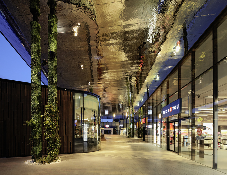 This cladding of the canopy provides a lively reflection of the busy life along the shopping boulevard. During the evening hours, a specially designed lighting concept intensifies this spatial experience for the visitors.