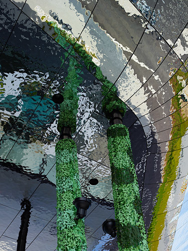 In the case of the shopping boulevard and the slim pillars of the canopy, the concept of the thoroughly landscaped outside areas is implemented by the use of climbing plants. These “green” pillars below the shiny canopy create a unique, lively and relaxing atmosphere. The visitors feel like they are walking through the green oasis.