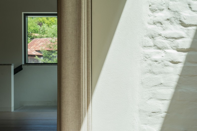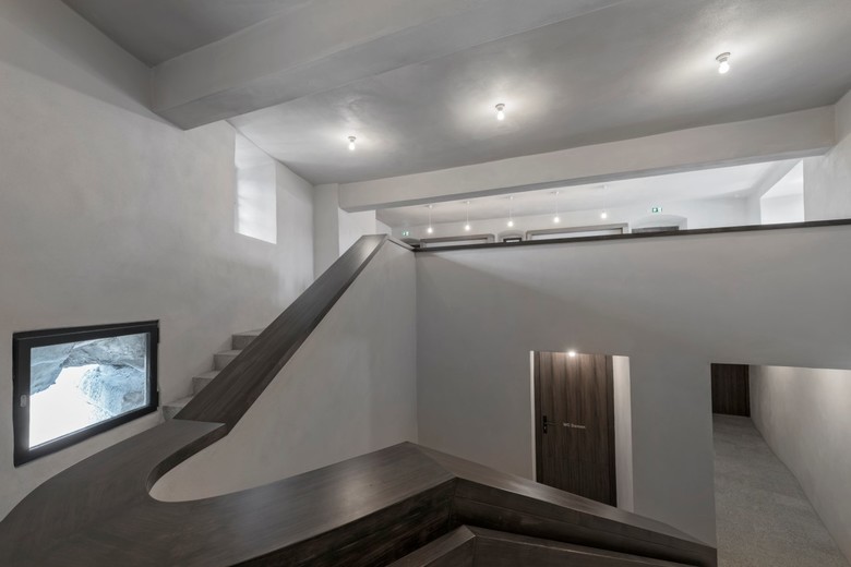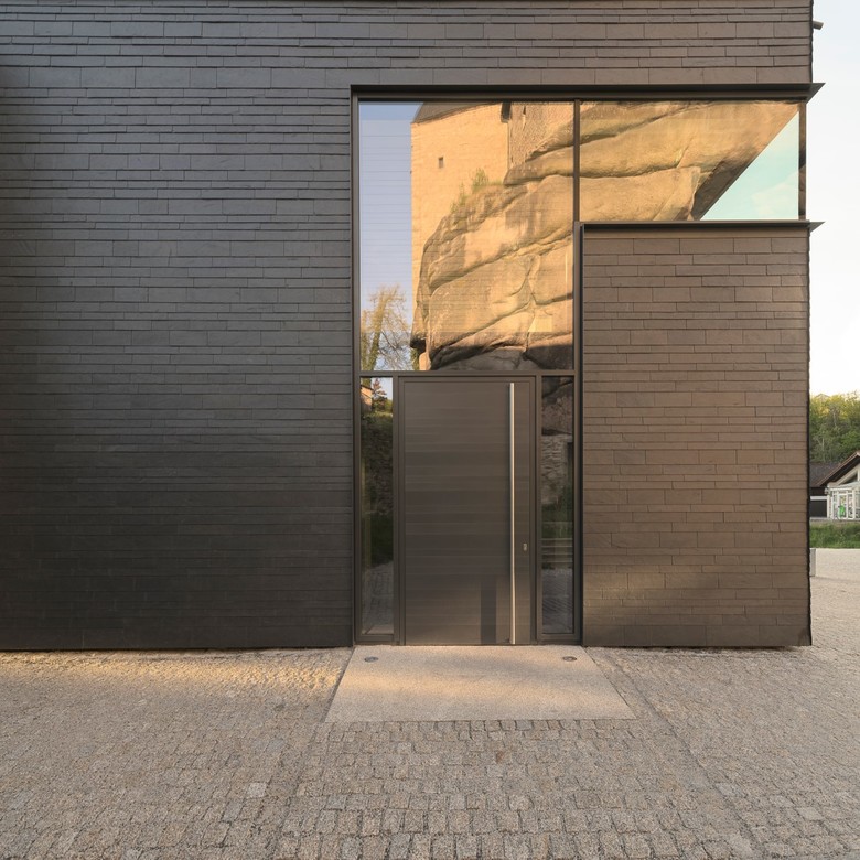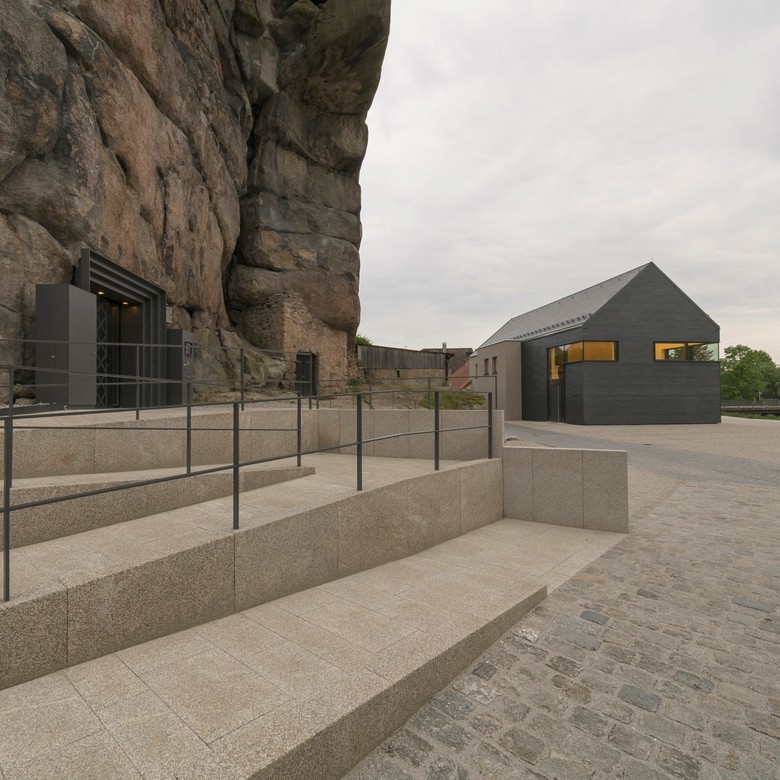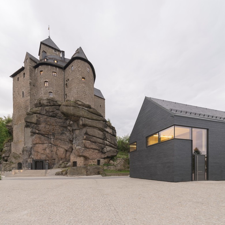 Intarsien im Stein versinnbildlicht unsere architektonische Idee. Die Burg wurde in ihrem markanten äußeren Erscheinungsbild belassen. Wir haben die vorhandene Substanz mit allem gebotenen Respekt vor der Geschichte sanft in zeitgemäße Architektur transformiert und technisch zukunftsfähig gemacht. Die Burgatmosphäre blieb spürbar erhalten. Aus präzise gefügten, wertvollen Einzelteilen entstand wieder ein großes Ganzes. Schlichte Materialität, nur mit Kalk geputzte, wohltemperierte, beeindruckende Wände, Schiefer, Holz in seinen unterschiedlichsten Facetten, und der allgegenwärtige Naturstein geben den Räumen ihre eigene Seele. Licht ist Teil der Räume. Die Blicke aus den Fenstern von Burg und Tagungszentrum zeigen Häuser im Dialog mit Vergangenheit, Gegenwart, Zukunft, dem Ort Falkenberg selbst und den Menschen. Es sind einmalige Orte entstanden. Ein Weg im Fels, ein Burghof, Flure und Brücken, Zimmer in allen Himmelsrichtungen, jedes eine eigene Intarsie, Säle mit Kaminfeuer, Sitzplätze in den Wänden und ein Museum, das sich erinnert und lebt.