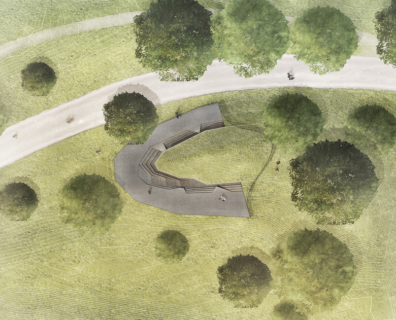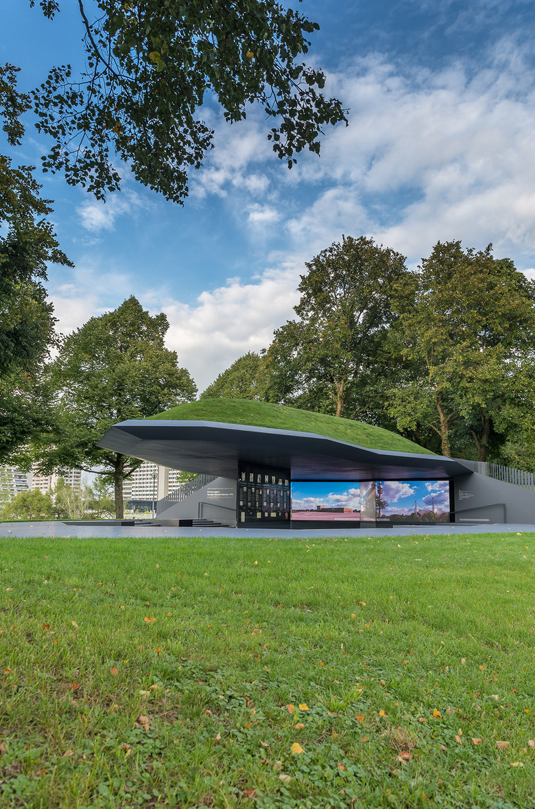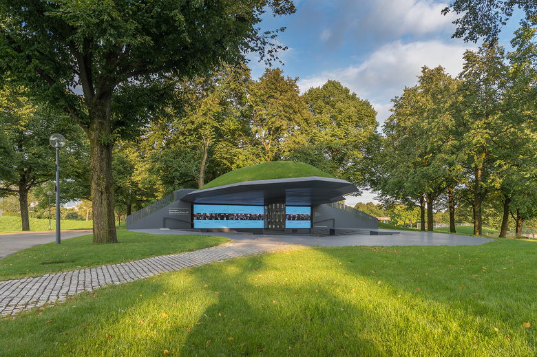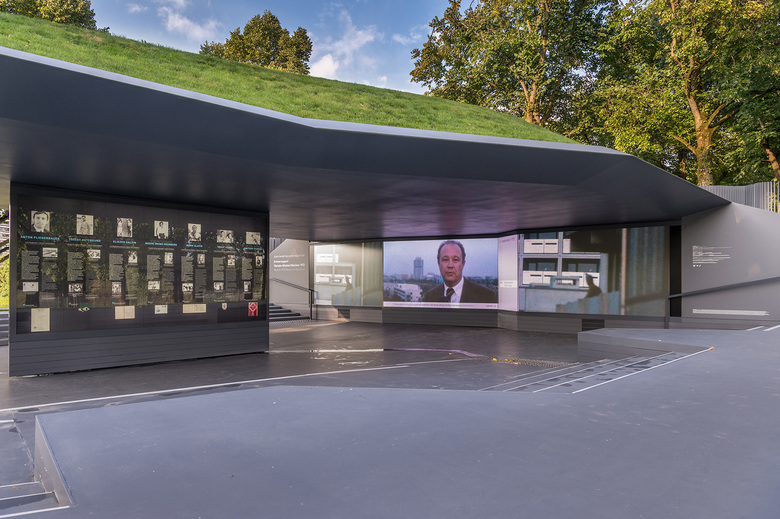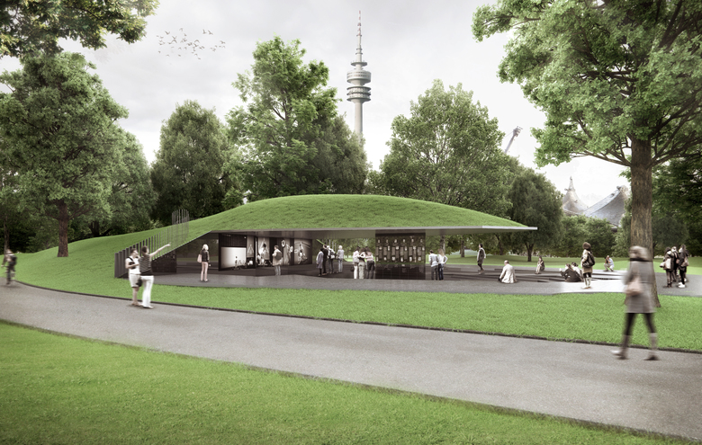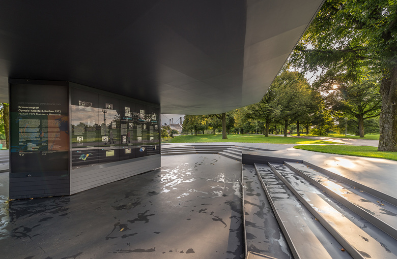 Wie selbstverständlich fügt sich der Erinnerungsort in die Olympialandschaft ein. Präzise Schnittflächen in eigener Materialität und homogener Oberfläche definieren den Einschnitt. Der entstehende Raum tieft sich abgestuft in die Landschaft ein. Die Stufen der Absenkung und damit auch die Form der Präsentationsebene folgen den nach unten projizierten Höhenlinien. Das der Landschaft Weggenommene wird geschützter Raum. Ein Gefäß für Erinnerung und Information entsteht, begehbar 24 Stunden am Tag und 365 Tage im Jahr, sich stetig verändernd mit der Witterung und im Wechsel der Tages- und Jahreszeiten.