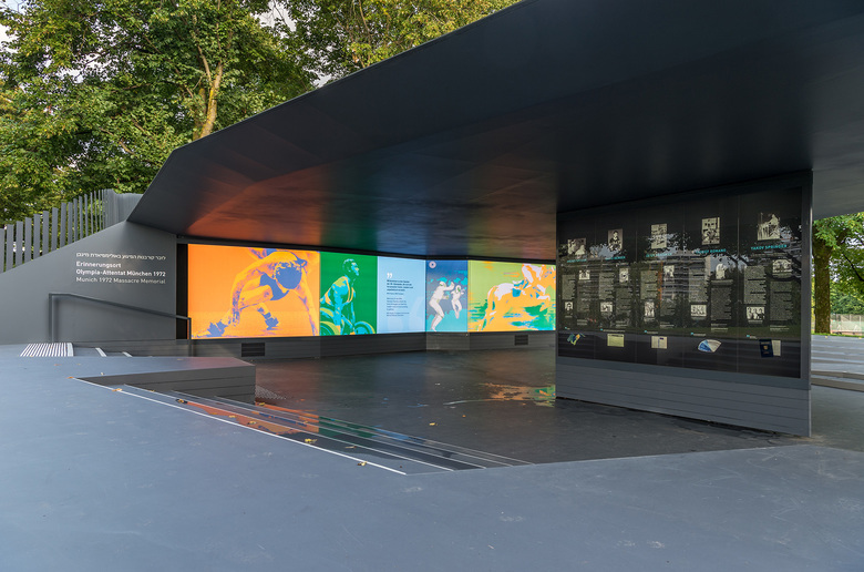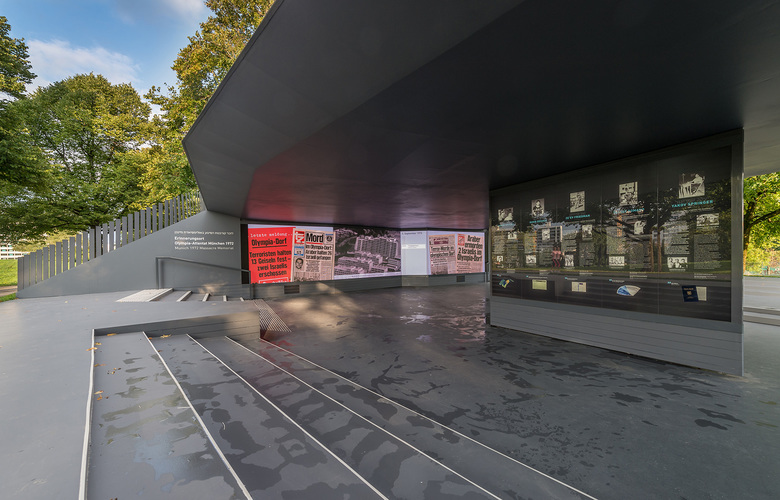 Der Erinnerungsort bietet ein beeindruckendes Panorama, das Blickbeziehungen zu den authentischen Orten des dramatischen Geschehens herstellt: Attentatsort, Olympisches Dorf, Pressehügel, Olympiaturm und die olympischen Sportstätten kommen in den Blick. Eine elf Meter breite Medienwand vervollständigt das Panorama. Ein intensiver Dialog zwischen der mit Bedeutung hoch aufgeladenen Umgebung und dem Erinnerungsort entsteht.