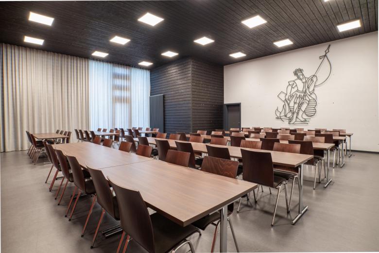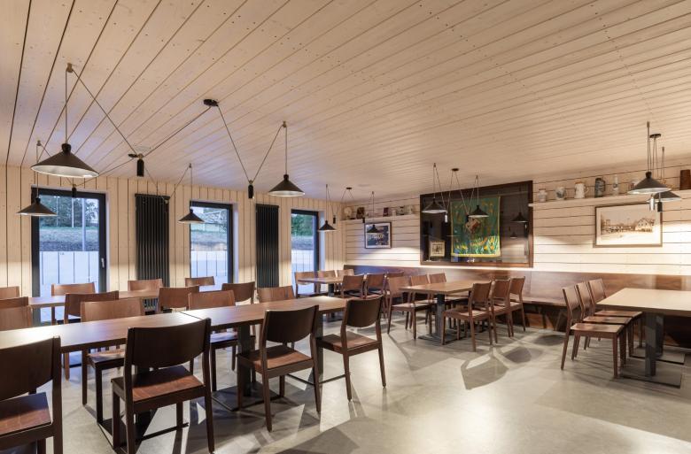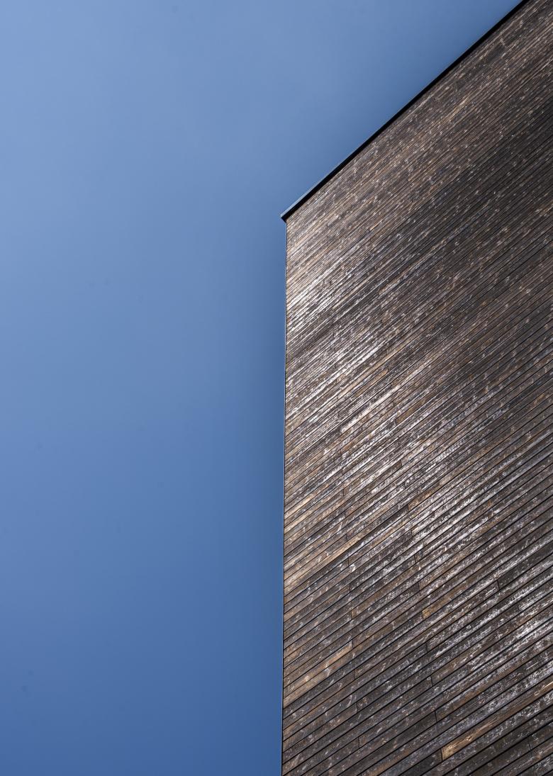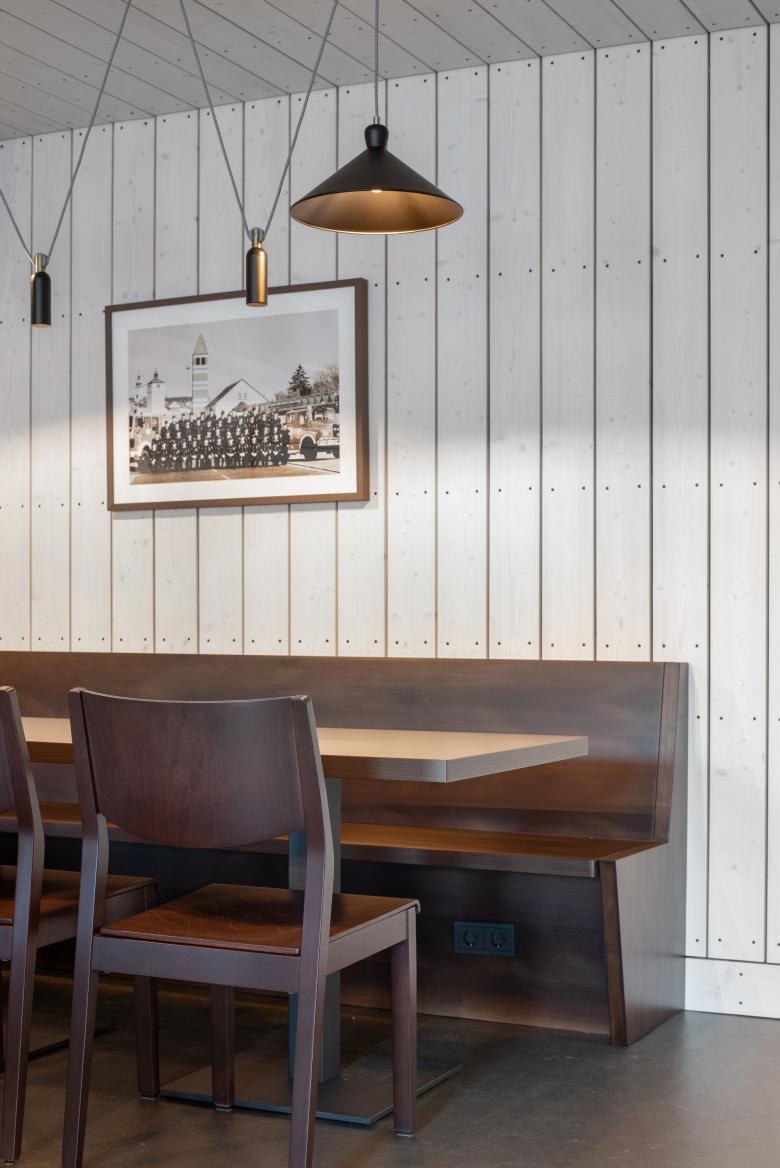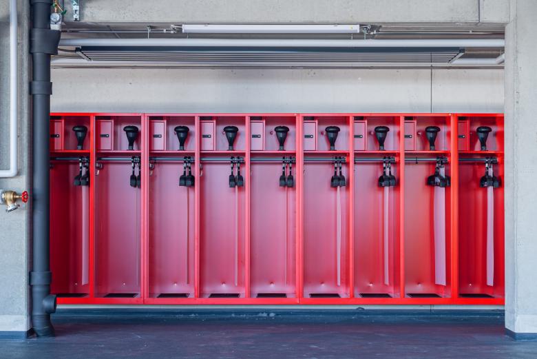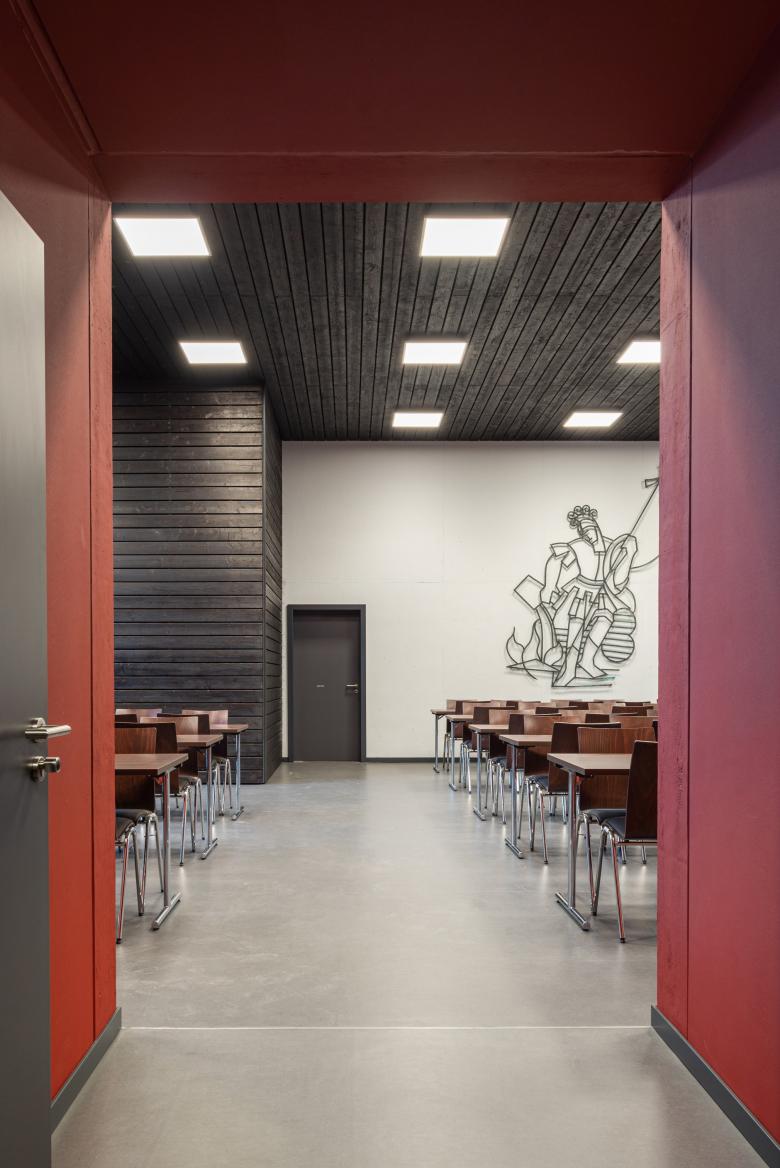 Feuer war eine unserer Inspirationen. Echtes Material trägt Information und weckt Neugier. Das neue Feuerwehrhaus trägt ein geflammtes, hölzernes Kleid, die dienenden Räume ein rotes – nicht nur die Farbe der Feuerwehr, sondern auch die des Flurstücks »Rote Erde«. Diese Farbigkeit zieht sich konsequent auch ins Innere. Die besonderen Räume wie die Floriansstube oder der Veranstaltungsraum tragen ein hölzernes Kleid wie die Fassade. Die Materialität von Waschhalle, Stellplätzen, Werkstätten und Nebenräumen ist funktional aber wertig: Putz, Metall, Beton.