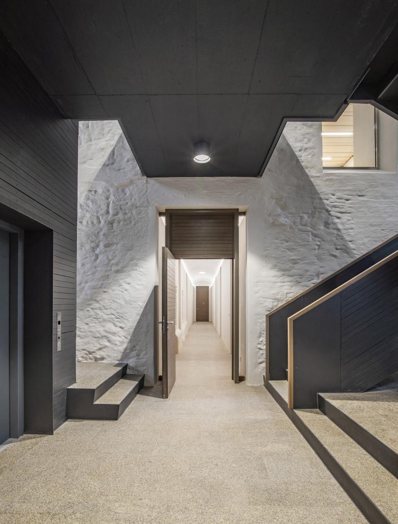 Atmosphäre, Material, Licht und Raum spielen eine herausragende Rolle. Mit Kalk geputzte, geschlämmte Wände, steinerne und hölzerne Böden. Eichenholz und Granit. Außenanlagen aus einem speziell für dieses Haus gebranntem Ziegel der die Farbigkeit der Feldsteine des Granits trägt.