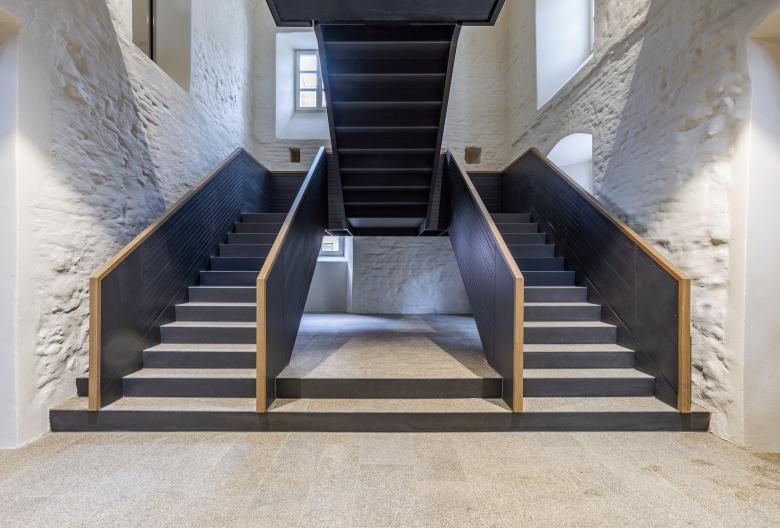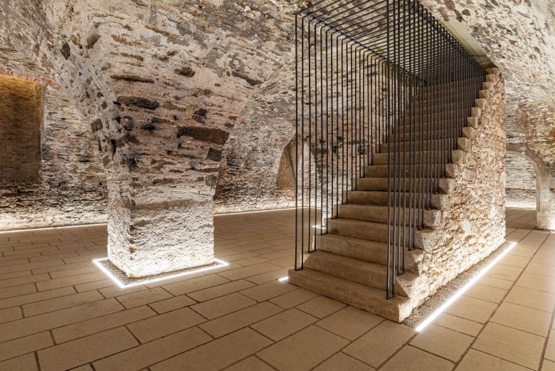 Grundidee unseres architektonischen und städtebaulichen Konzeptes war es, Architektur als begehbare und erlebbare Geschichte zu denken. Aus den Mauern wurden die Außenanlagen für den neuen Hochschulstandort entwickelt. Die verschiedenen Zeitschichten bleiben im Mauerwerk deutlich erlebbar und ablesbar. Bewusst kein Gebäude, sondern eine Gartenanlage, wie früher schon einmal, ein Stadtbalkon, ein Hochschulgarten mit Blick auf das neue Gartenschaugelände. Zugleich wird aus einem jahrelang abgeschotteten und aus Sicherheitsgründen nicht zugänglichen Bereich ein öffentlicher, der auch eine barrierearme Verbindung zwischen dem Naherholungsgebiet und dem Stadtzentrum schafft. Auch die verschütteten Gewölbekeller wurden freigelegt und sind als Zeitdokument wieder erlebbar. Eiserne Gitter und die alten Fackelspuren erinnern an die frühe Geschichte des Gebäudes.