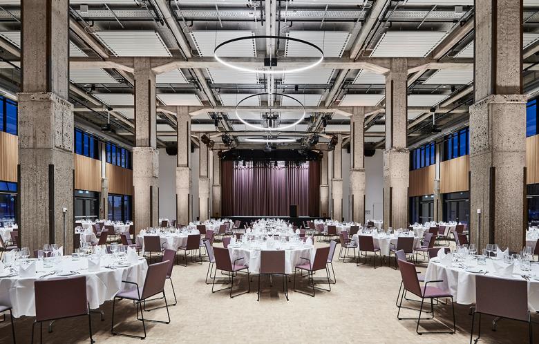 Ergänzt werden die leuchtenden Lebensadern durch abgehängte Ringleuchten, für das Projekt entwickelte Sonderanfertigungen. Sie erinnern in Form und Anmutung an traditionelle Fassreifen und stellen auf diese Weise einen Bezug zur historischen Nutzung des Areals her.
