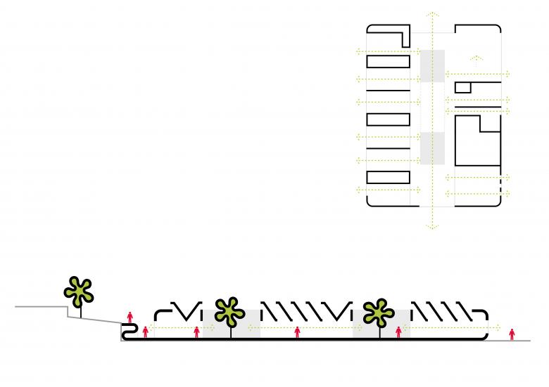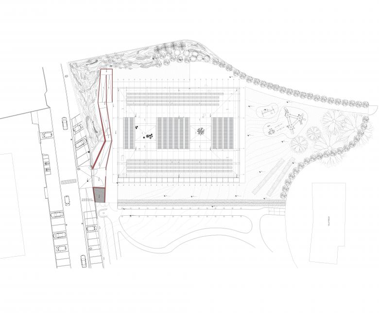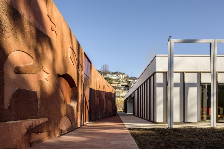 The deactivated red concrete wall impacts the landscape, transforming into a play ramp that children will recognize as part of their school’s identity. It serves as a ramp or houses the heating pumps. It is also a ramp where the animal figures from the famous puzzle Enzo Mari designed for Danese in 1957 are engraved.