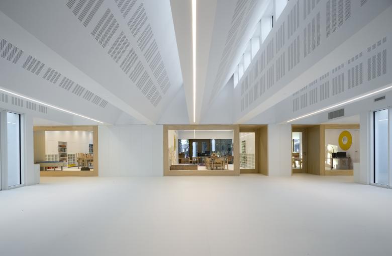 The layout of the school is tripartite, with flexibility being the key element. While each room is named, the central hall and its connection to the lateral wings enable the spaces to be used in multiple ways, fostering innovative teaching methods. This encourages teachers to express their creativity for the benefit of education. All spaces can easily be transformed into art laboratories, areas for digital and theatrical activities, gyms, or theatre spaces. The same flexibility also allows the community to use the school beyond regular hours, thanks to the large central hall. This space, with its expansive windows, invites the surrounding park's greenery to flow inward from all directions.