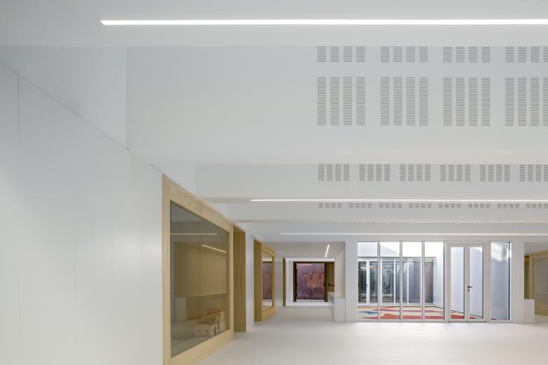 The hall is a central distribution space, but also a multifunctional area, a space of potential for the creation of special events. Two internal courtyards carve out the building as "special open-air rooms," allowing even the little ones to stay outdoors as much as possible without danger. These courtyards are floored with a soft anti-shock carpet and populated by the same colorful animals designed by Enzo Mari. The central space soars in height, punctuated by a series of shed skylights set at 240 cm, which bring light into the innermost areas of the school: an indirect, diffused light that counterbalances the brightness of the windows and courtyards.