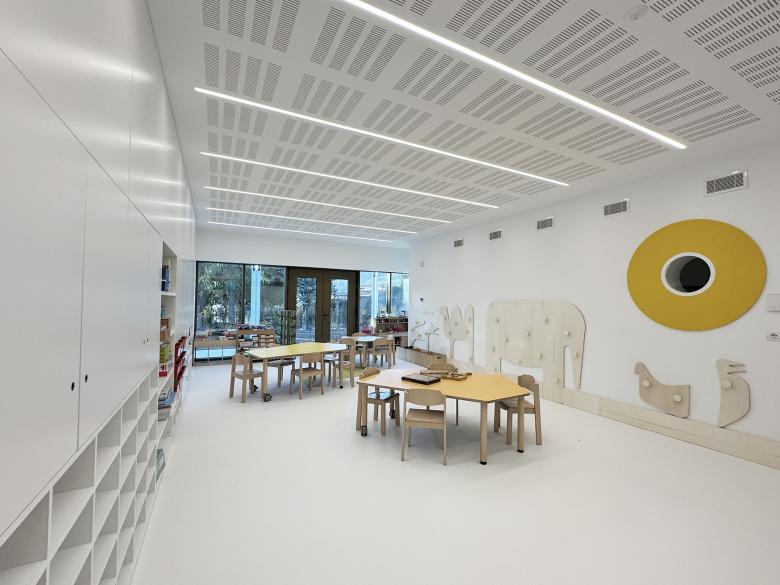 The choice of materials is carefully considered: it assigns the points of contact between the children and the space to wood and promotes intervisibility among all areas. Great attention was given to material selection to ensure excellent acoustics in every space.