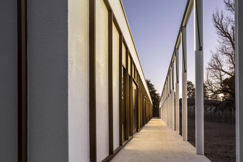 Each classroom has a direct exit leading to the external portico, which is a tribute to Terragni's design for the Sant'Elia Nursery School in Como. This portico features a series of metal pillars supporting external curtains that approach the facade without touching it. The external lighting of the school is also integrated into the system of detached pillars.