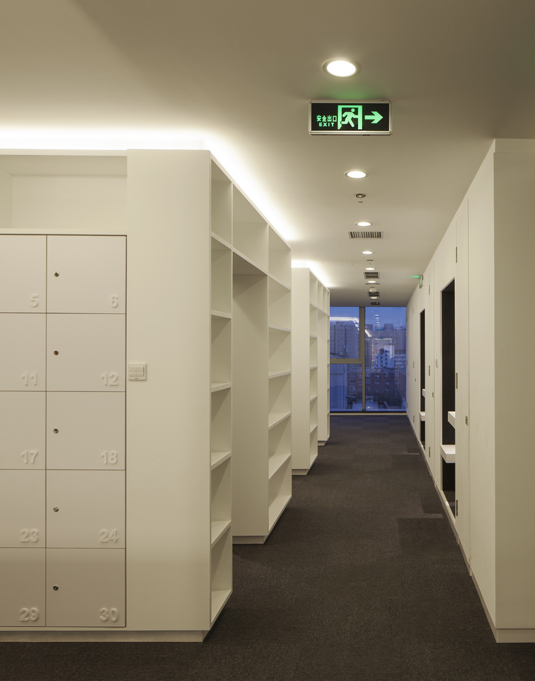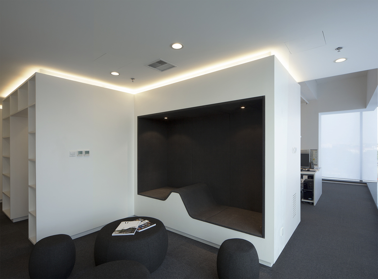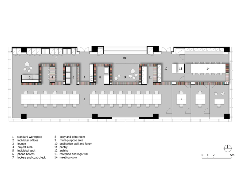 Following the reception is a pantry area, a multi purpose room, a copy and print area, a coat check with individual lockers, a pinup wall and phone niches and a small open meeting area. A relaxation zone completes this linear sequence of functions at the other end.
