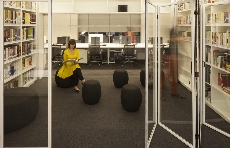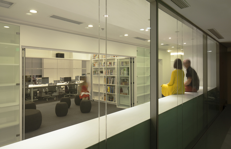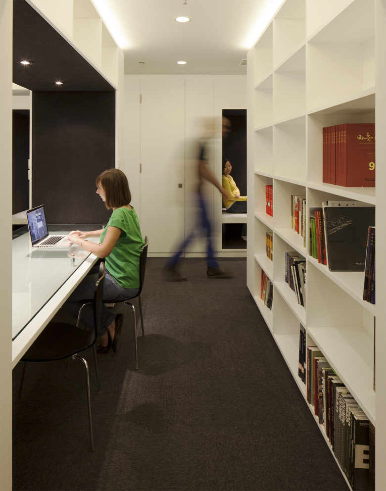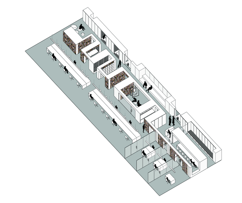 Following a strict linear order, a high functioning, compressed program, translates into a simplified design. A large supply of bookshelves defines the organizational system for the whole office. Providing ample spaceto store and archive magazines, books and documents related to publications.