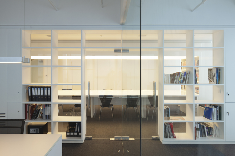A spine of bookcases defines the working environment for this publishing company. Incorporating seating niches, working surfaces, meeting spots and small rooms. Supporting the company's goal of a new working method. Amove towards a nonhierarchical contemporary office.