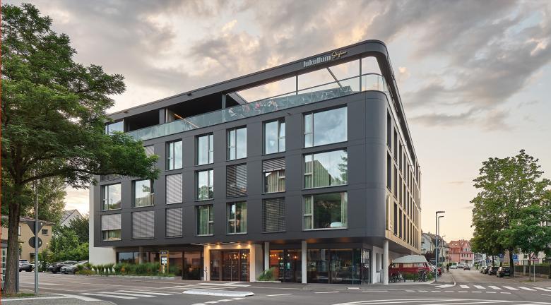 Das Gebäude wurde als geradliniger Baukörper städtebaulich an der Straßenkarte am Stadtpark in Friedrichshafen mit Ausblick zum See platziert.