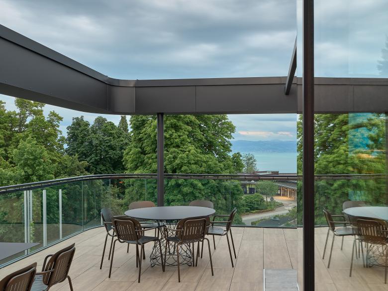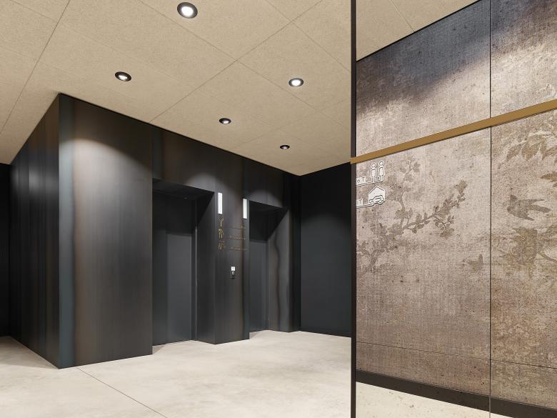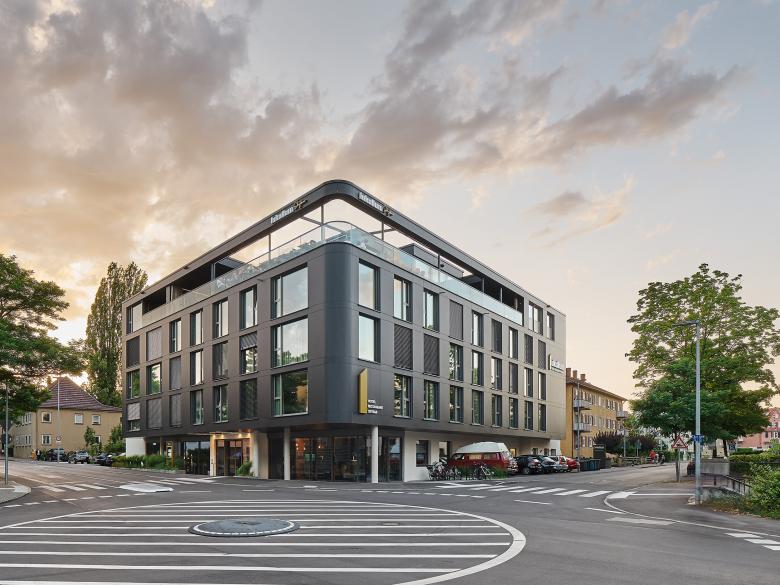 Eine hochwertige dunkle Aluminiumfassade mit großen Fensterformaten formt den Hauptbaukörper. Das Erdgeschoss ist zurückgezogen und formuliert so den Zugang zum Gebäude, gleichzeitig lässt es den Hauptbaukörper schweben. Auf dem Dachgeschoss wurde eine Skybar mit grosszügiger Dachterrasse platziert.