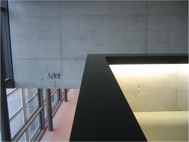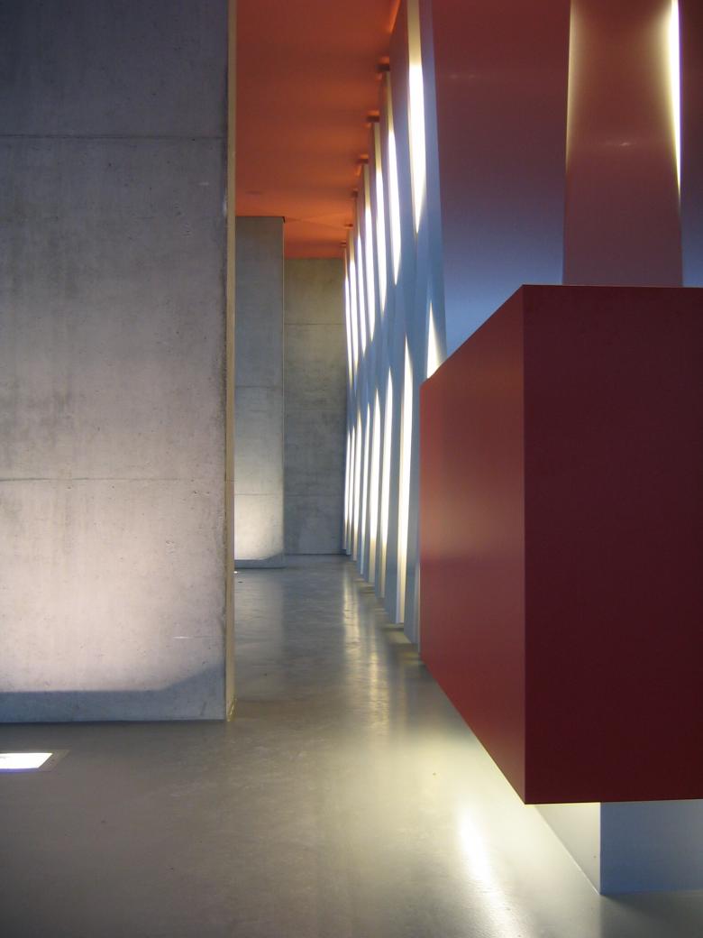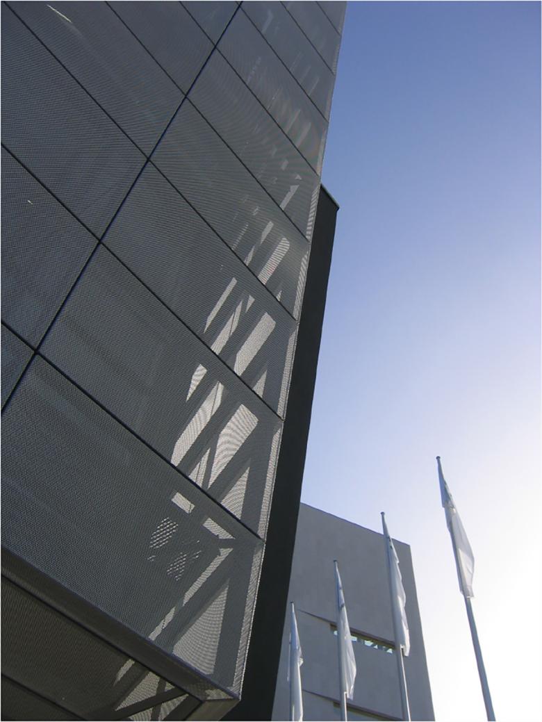 Die Fassade wurde mit Streckmetallelementen überzogen um der Fassade eine Tag- und eine Nachterscheinung zu geben. Der Baukörper wirkt tagsüber monolithisch scharf kantig geschnitten, nachts von innen erleuchtet kehrt sich das Innere nach aussen und die wandelnden Besucher werden selbst zur Kulisse.