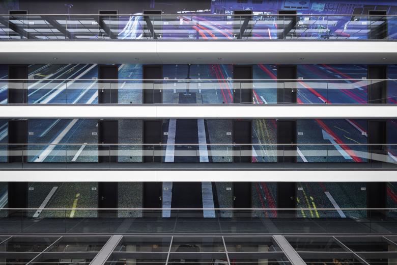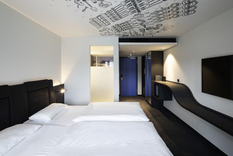 Die Galerien des Atriums tragen großflächige Bilder über vier Geschosse von nächtlichen, befahrenen Strassen. Diese Bilder erschliessen sich dem Gast wenn er sein Hotelzimmer verlässt an der gegenüberligenden Galerie in voller Höhe und stimmen den Hotelgast auf die autoaffinen Themen ein. Im Erdgeschoss erwarten den Gast 5 Car-Suites. Hier kann der Hotelgast mit seinem eigenen Fahrzeug in einem Hotelzimmer übernachten. Durch eine raumhohe Innenverglasung kann er sein Lieblingsfahrzeug vom Bett aus betrachten und erleben.