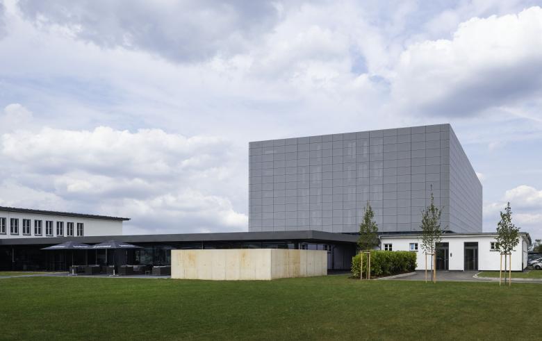 Die vier verschiedenen Bauteile wurden über eingeschossige, zurückhaltende moderne Bauteile in Form von schwarzen Stahldächern mit zurückgesetzten Glasfassaden miteinander verbunden. Diese Bauteile stehen im Kontrast zu den weissen einfachen Bestandsbaukörpern und nehmen in den Kontrast der Basaltelemente in den Bestandsgebäuden auf. Die Höhe der Verbinungsbauteile wurde so gewählt dass die flachen monolithischen Dächer sich unter die Regenrinnen des Bestandes schieben und diese Baukörper in Ihrer primären Funktion und Mächtigkeit in der Hierarchie unterstützen.