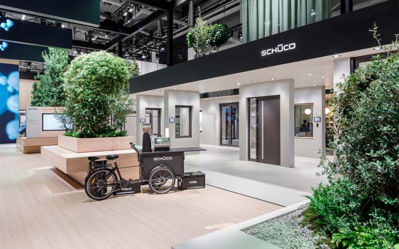 Das gebaute Standvolumen wurde gegenüber dem Aufritt von 2019 um ganze 60% reduziert. Nach der Messe erfolgt eine Maximierung der Wiederverwendung aller Exponate und Standbauelemente, beispielsweise in den Schüco Showrooms. Die Bäume wurden der Messe München gespendet. Der Versand von Einladungen erfolgte ausschließlich digital, auf gedruckte Broschüren wurde komplett verzichtet, sowie digitale Visitenkarten für das Schüco Team eingeführt.