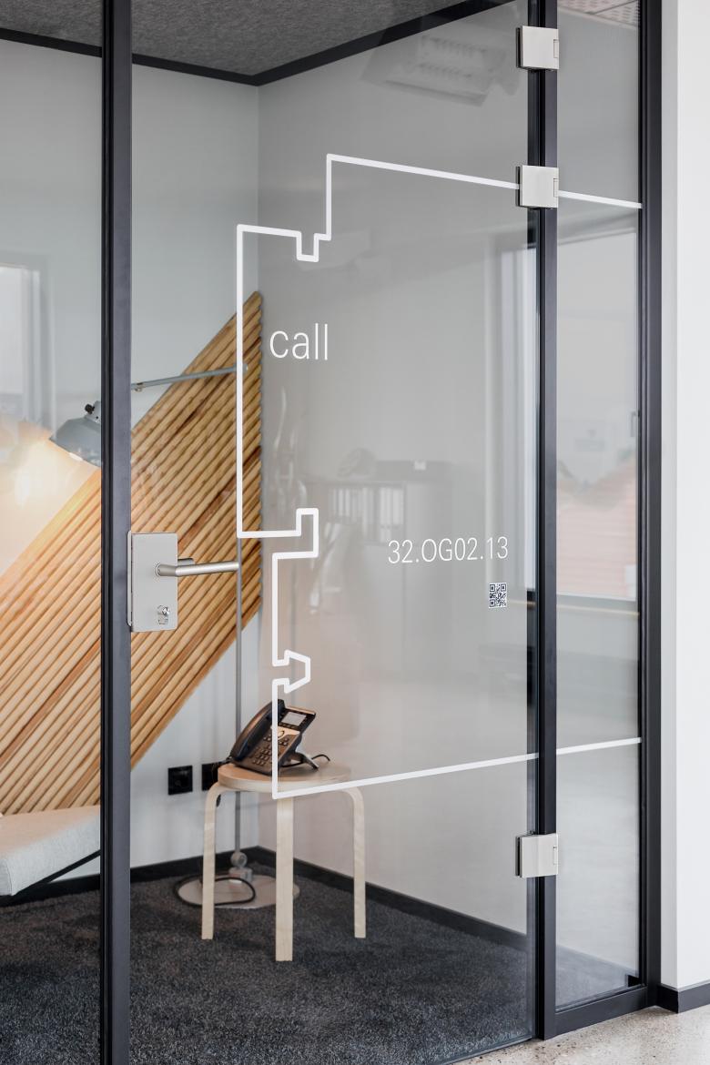 Dart hat eine Signaletik für Orientierung im Gebäude und Zuordnung von Office-, Work- und Meeting Areas entwickelt. Die Formsprache beruht auf Elementen aus Schücos Produktportfolio: Individuelle Outline-Grafiken abstrahieren die Profile von Fenster- und Fassadenelementen und weisen Räume ihrer Funktion entsprechend aus. Durch minimale, sachliche Gestaltung und klare Typographie erhalten alle Flächen eine nachvollziehbare Struktur und gute Übersicht.