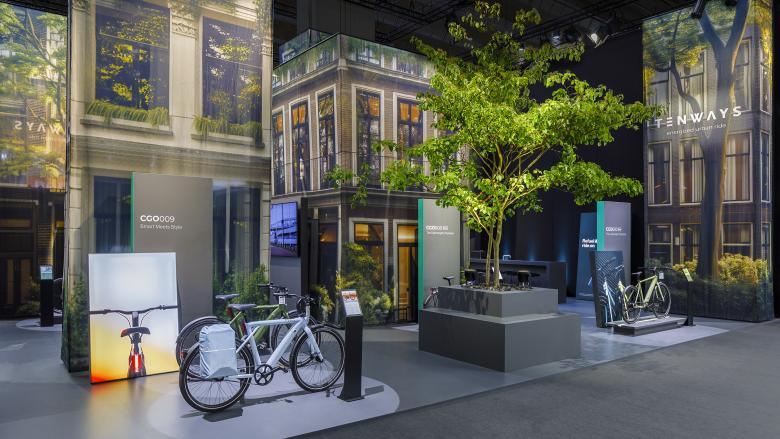 Mit dem urbanen Setting wird eine Stadt erschaffen, die die E-Bikes in einem idealen Kontext und Fokus präsentiert. Nachhaltige Konzepte sind uns und TENWAYS wichtig. Daher freuen wir uns sehr, dass die Stoffgrafiken in Verkaufsräumen wiederverwendet werden. Die gemieteten Bäume kehrten nach dem Auftritt in die Baumschule zurück. Insgesamt ein Markenauftritt, der in den nächsten Jahren mehr „energized rides“ verspricht.