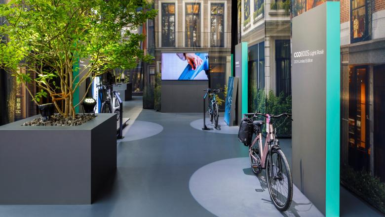 Inspiriert vom Bühnenbau, kreieren abgehängte Stoffbahnen Flächen und Volumen, die das Gefühl einer „Pop-Up-Stadt“ vermitteln. Im Scheinwerferlicht wird der Fokus auf die Hauptdarsteller gelenkt: Gestaffelte Bühnen präsentieren die verschiedenen E-Bike-Modelle, ergänzt durch stimmungsvolle Lightwalls, die die einzigartigen Details der Produkte betonen.