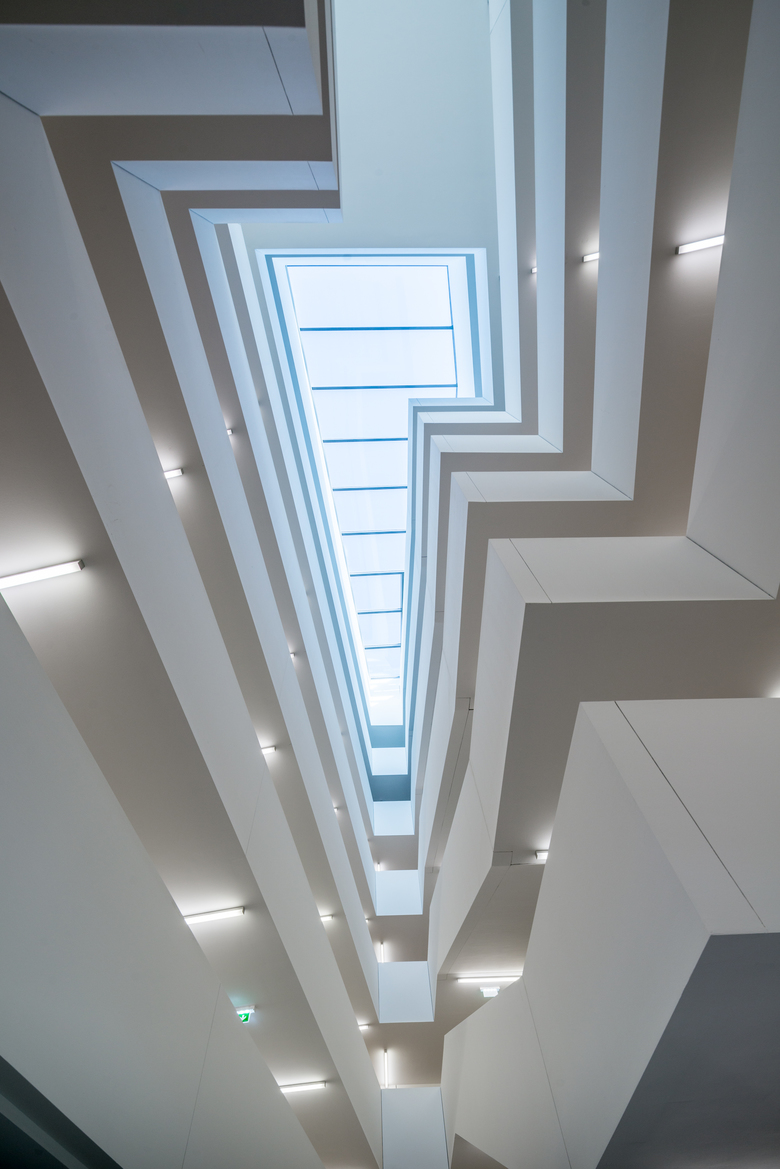Den nördlichen Bereich haben wir mit drei Bauten gestaltet, die einen zentralen, ruhigen Platz für die Bewohner bilden. Die Abknickungen der beiden Solitäre öffnen das Areal nach Süden und unterstützen die Durchlässigkeit. Ein umlaufendes Loggienband und die vollflächige Verglasung bringen Licht und Offenheit in die Wohnungen und bieten den Bewohnern weite Ausblicke auf den Park und die Stadt. Ein besonderes Highlight ist das lichtdurchflutete Atrium, das für einen geförderten Wohnbau bemerkenswert großzügig dimensioniert ist.