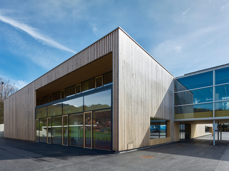 Die neue Hauptschule und der Mehrzwecksaal wurden in zwei Phasen im Abstand von zehn Jahren errichtet. Das Raumkonzept des L-förmigen Gebäudes umfasst drei Hauptfunktionen: Schule, Sporthalle und Bibliothek. Die 2003 fertiggestellte Schule wurde in der Rekordzeit von 18 Monaten in Holzbauweise errichtet und erfüllt als erstes Schulgebäude Österreichs die strengen Passivhausrichtlinien. Zehn Jahre später wurde die stark sanierungsbedürftige Turnhalle durch eine neue Mehrzweckhalle ersetzt. Präzise Planung, die kompakte Organisation des Programms und ein hoher Grad an Vorfertigung ermöglichten eine kurze Bauzeit und optimierte Kosten, ohne Abstriche bei Design und Qualität zu machen.