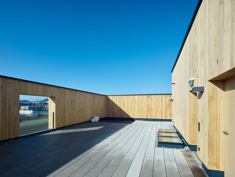 The covered entrance leads into the foyer with reception and presentation area and connecting back office. Offices and a meeting room are located on the first floor. The second floor is divided into two parts and houses offices as well as a training room, which extends via seating steps to the third floor and directly adjoins the lounge and bar area with staff kitchen. The roof garden and the raised roof terrace offer wide views on the Ötscher mountains.