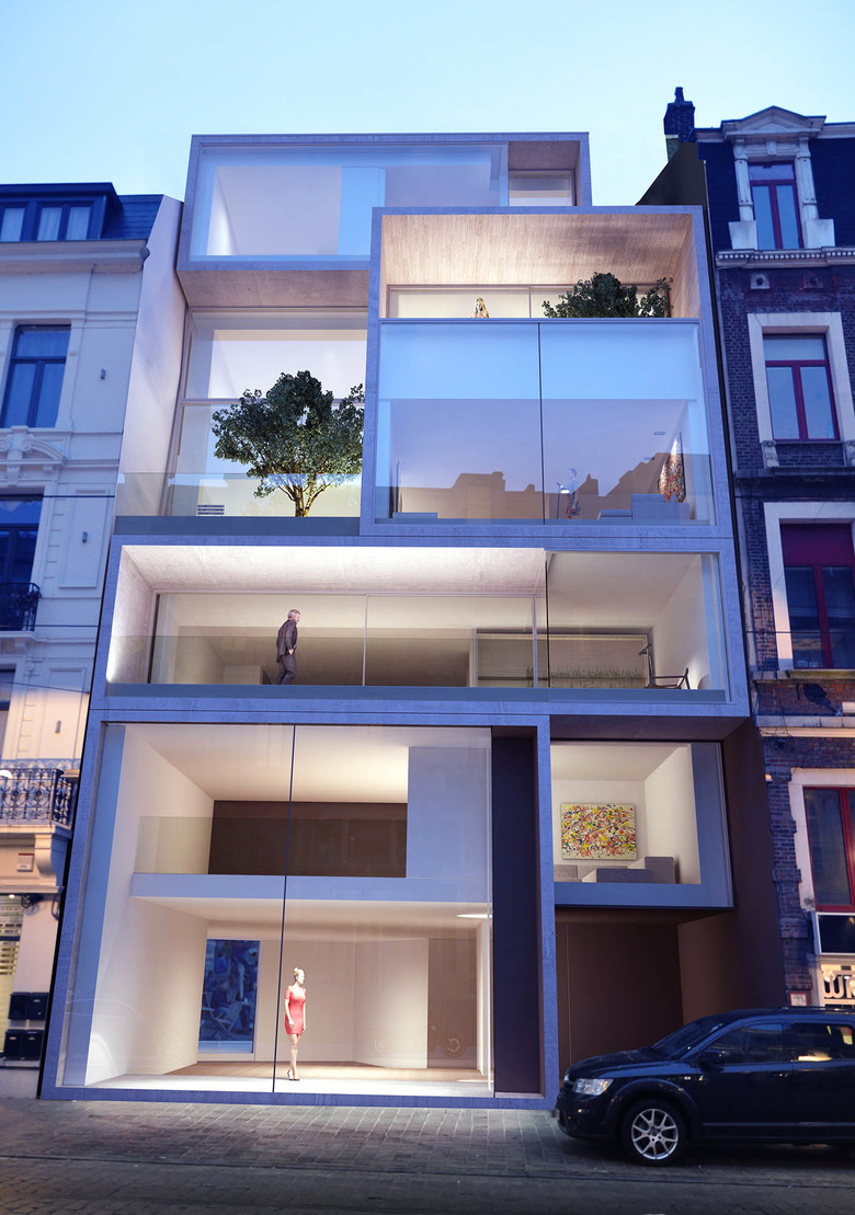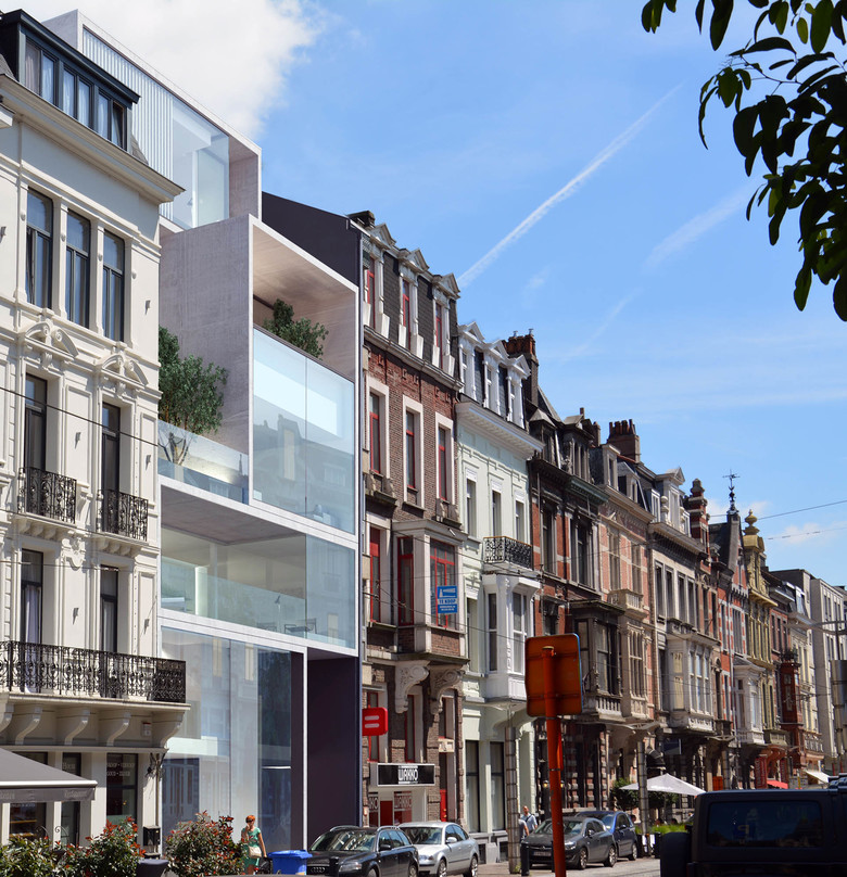 Instead of copying or abstracting the typical façade grids of the historic facades, we went back to the core principles of the 19th century Golden Ratio, to create our own purified grid that still remains linked the the old one. Adding the idea of stacked concrete frames underlines the proportions, but also creates massiveness to the building. Inside the frames, lucid glass boxes determine inside and outside space, both in a horizontal and vertical sense.