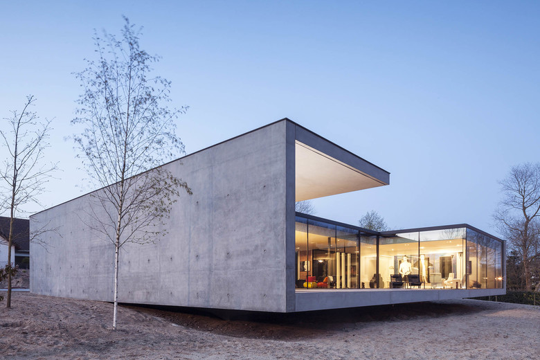 Having the horizontal concrete volume rise above the natural dune, the house becomes a light and pure sculpture, serene and in balance with its environment.