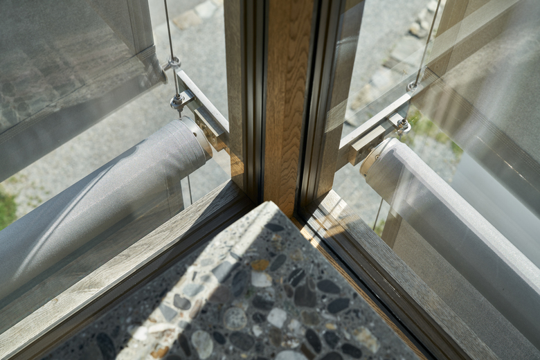Der Sonnenschutz ist an filigranen Schwertern befestigt, welche aus den Holzpfosten hinauskragen. Die Drahtseilführungen sind einteilig über drei Stockwerke durchgehend und jeweils an den Schwertern geführt. Sämtliche Stahlteile sind aus Chromstahl. Das transparente Textil ist doppelseitig aluminisiert.