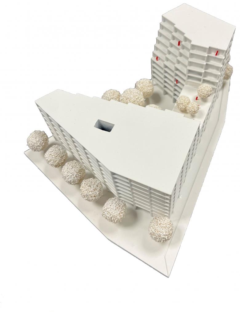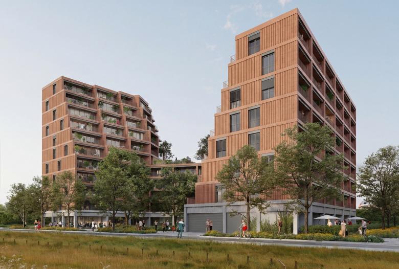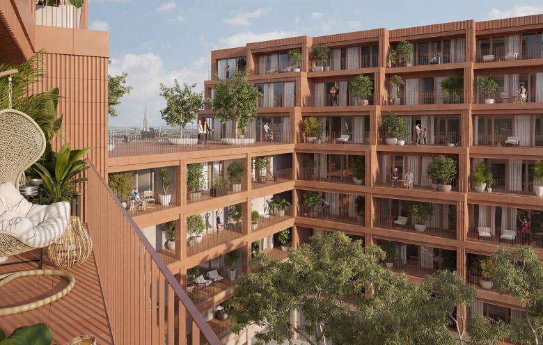 Mit dem Wohnbau ÖBB Neues Landgut soll ein einheitliches, identitätsstiftendes Ensemble zweier miteinander verbundener Volumen um einen Hof etabliert werden, das einerseits in die Umgebung eingebettet liegt, andererseits aber auch starke wohnbezogene Qualitäten aufweist, um zukünftigen BewohnerInnen ein gutes Leben zu ermöglichen. Durch den Grundrisszuschnitt und durch die hofseitig nach oben rückspringende Abtreppung der Baukörper entsteht eine Geste der Öffnung nach Süden und eine Geste der Öffnung nach oben. Die Öffnung nach Süden ermöglicht eine Einbindung des Wohnensembles in das umgebende Umfeld. Die Öffnung nach oben führt zu qualitativ hochwertigem natürlichen Lichteintrag in die unteren Bereiche und in den Hof und damit zu einer hohen Aufenthaltsqualität des Hoffreibereichs.