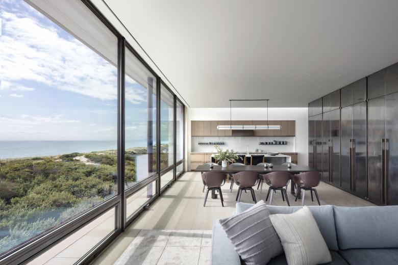 The entry foyer has been designed as a double height “cut” through the building, emphasizing the views of the surrounding dunes. The master suite cantilevers over the pool terrace with floor-to-ceiling windows capturing 180-degree headland, pond, and ocean vistas. The main floor features a cantilevered terrace roof with a “James Turrell” hole that invites the gazer’s eye skyward.