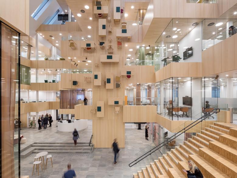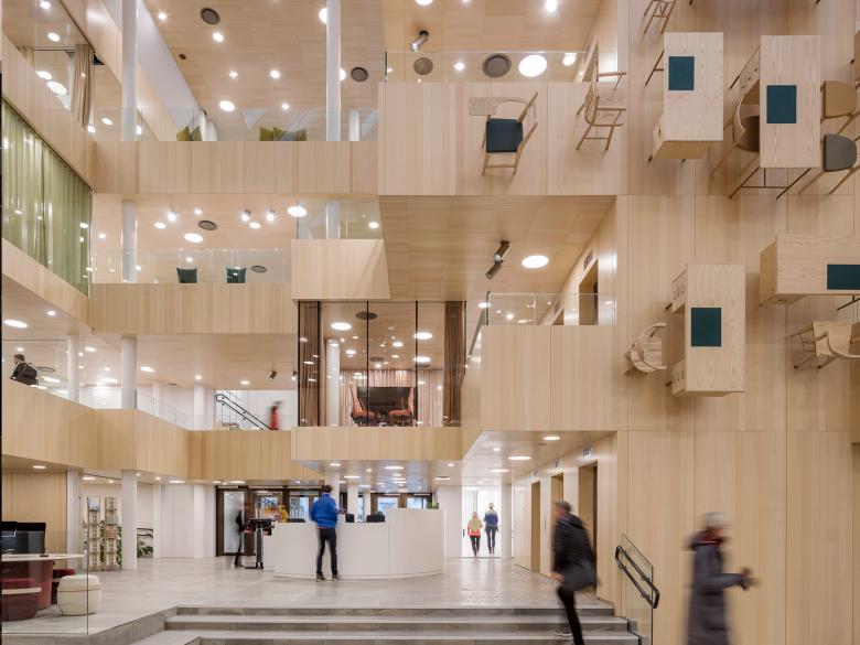 Für das Rathaus der norwegischen Kommune Bodø haben sich die Architekten von ALL | Atelier Lorentzen Langkilde Kopenhagen ein besonderes Stilelement überlegt: Im fünf-stöckigen Atrium erwartet die Besucher eine vertikal angeordnete Bürolandschaft, herausragende Besprechungskuben und Balkone, die im Gesamtbild an die optischen Täuschungen von M. C. Escher erinnern. Als ruhigen Kontrast hierzu setzte man auf eine einheitliche Raumgestaltung in Esche und Eiche. Die Projektabwicklung des Ausbaus kam dabei von der Lindner Group mit dem Geschäftsbereich International Projects.
