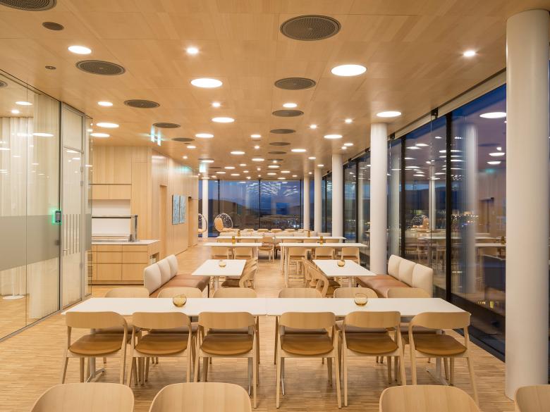 Optisches Highlight im Atrium ist die ungewöhnliche Wandgestaltung: Hier wurde eine Bürolandschaft um 90 Grad gedreht und die Möbel vertikal entlang einer Wandverkleidung befestigt. Von den Treppen im Erdgeschoss aus, die gleichzeitig als Sitzgelegenheiten für Veranstaltungen, Konzerte etc. dienen, hat man einen guten Blick auf das ungewöhnliche Arrangement. Eine besonders schöne Aussicht bietet auch die Kantine im obersten Geschoss, durch raumhohe Fixverglasungen hat man direkte Sicht zum Hafen und den dahinterliegenden Inseln. Der Kantinenbereich wurde ebenfalls mit akustisch wirksamen Wand- und Deckenverkleidungen in Esche furniert ausgestattet, kombiniert mit Glaselemente, die weitere Besprechungszimmer abgrenzen. Die gleichen Elemente finden sich in den sanierten Bestandsgebäuden, die über ein verglastes Treppenhaus mit dem Neubau verbunden sind. Die brandschutzgeprüfte Fixverglasung (EB 120, europ. Norm) wurde aus Elementen mit einem Einzelmaß bis zu 3,10 m ausgeführt und umfasst eine Gesamthöhe von ca. 9,50 m. Der Zugang zum Treppenhaus ist wiederum die Sitztreppe im Atrium, eine Sonderanfertigung mit 20 mm starkem Parkettbelag aus massiver Eiche.