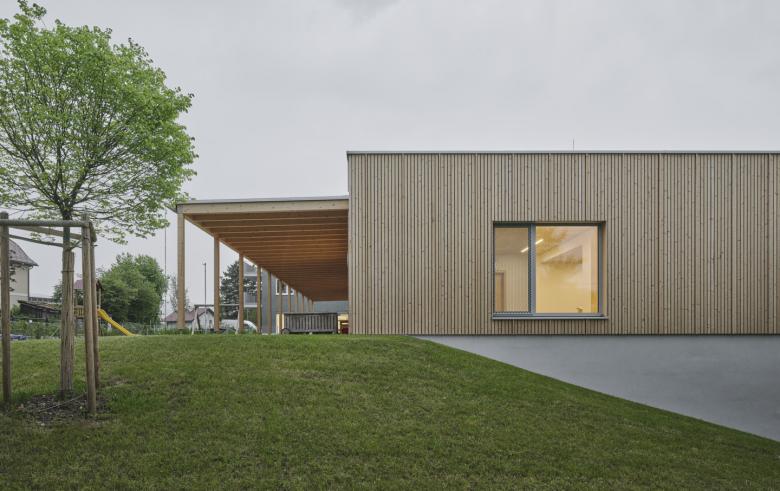 In unmittelbare Nähe zum markanten Kirchenhügel, nebst der bestehenden Volksschule und in Laufdistanz zum örtlichen, öffentlichen Nahverkehr, wird ein neuer 3-gruppiger Kindergartens situiert. Das nach Norden abfallende Grundstück wird mit einem abgetreppten Baukörper bestmöglichst ausgenutzt. Die im Süden vorgelagerte Spielebene bleibt dadurch größtmöglich erhalten.