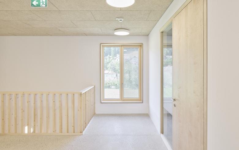 Der zur Zufahrtsstraße eingeschossig-wirkende Kindergarten mit rhythmisierter Holzfassade beheimatet 75 Kinder in 3 Gruppen und bietet ausreichend Spielfläche mit Nutzung des Hanggrundstückes als Rodelbahn. Die notwendige Aufstockung auf 4 Gruppen wird vorgesehen und kann bei Bedarf als drittes Geschoss aufgestockt werden.