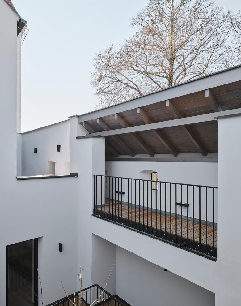 Der Zugang zum Altstadthaus erfolgt weiterhin vom Stadtplatz, wobei der historische Eingang wieder aktiviert wird. Ein zentraler, lichtdurchfluteter Flur bildet die innere Erschließungsachse des Hauses. Entlang dieses Flurs liegt das neue Stiegenhaus mit Lift, das die vertikale Erschließung übernimmt. Der Weg führt weiter in den Hof und verbindet über eine Nebenraumzone im Erdgeschoss des neuen Hofhauses den zweiten Zugang – das bestehende Tor in der Stadtmauer.